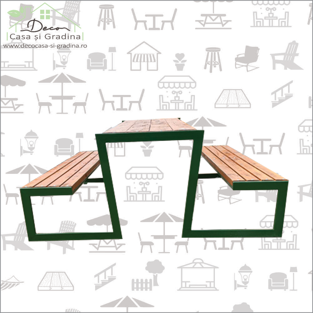 Set masa de grădină metalică cu lemn din pin termotratat si banci cu structura metalica cu lemn din pin termotratat